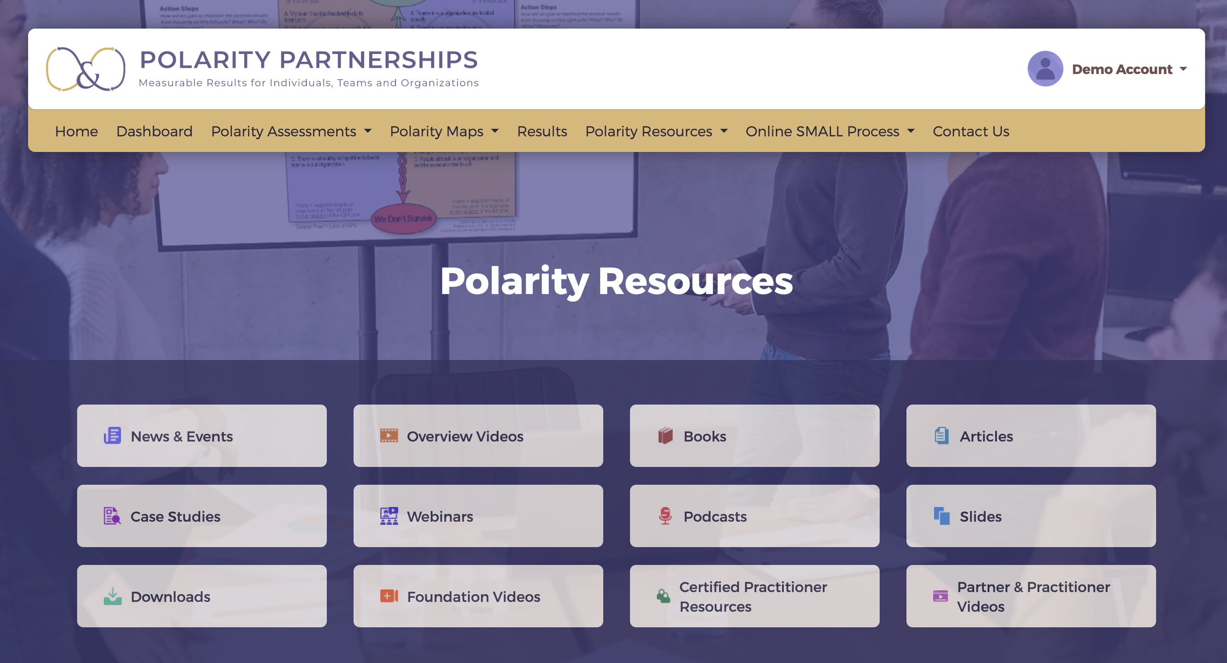 See, Map, Assess, Learn and Leverage your most critical Polarities in person or online via Zoom with an individual, team, or hundreds of stakeholders